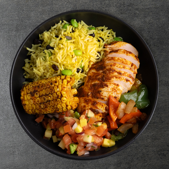 Kyckling(24%), majskolv(22%), basmatiris(20%), tomat, mango, SOJAbönor, svart bönor, paprika röd & grön, lök, rödlök, vitlök, örtkryddor, kryddblandning, salt m jod