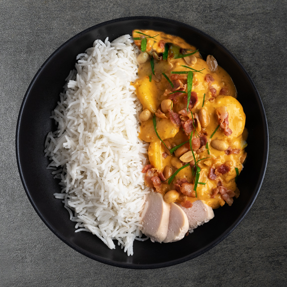 Basmatiris, kyckling(30%), banan(14%), GRÄDDE laktosfri, bacon(7%), MJÖLK laktosfri, JORDNÖTTER(3%), chili, socker, vinäger, SELLERI, salt m jod, kryddblandning.