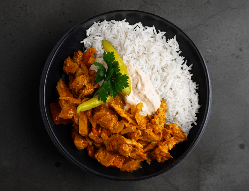 Kyckling(28%), basmatiris(28%), tomater, paprika, YOUGHURT laktosfri, lök, feferoni, CREMÉ FRAICHE laktosfri, ÄGG, rapsolja, vitlök, salt m jod, örtkryddor, kryddblandning