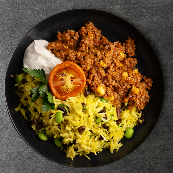 Basmatiris(31%), nötkött, laktosfri kvarg, tomat, SOJAbönor, svarta bönor, majskorn, vitlök, salt m jod, örtkryddor, kryddblandning